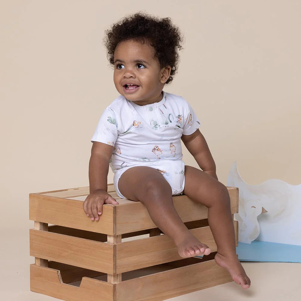 Snuggle Hunny organic bodysuits are made for babies and toddlers and our exclusive print is bright and very cute. This bodysuit is short-sleeved, perfect for warmer weather, and under layers. Soft and stretchy, they are easy-care and coordinate well with our pants and shorts. All Snuggle Hunny clothing is made with GOTS Certified Organic Cotton.