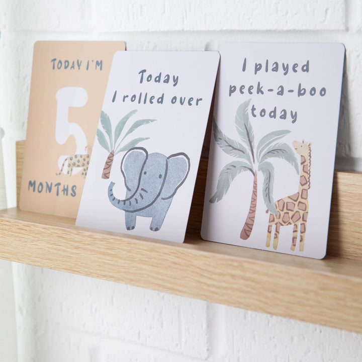 This set of 13 double-sided milestone cards features some of your little one's big moments. From hello world to 1 year old, these matte, heavyweight cardstock cards are perfect as a baby shower, new baby present and nursery decorations.