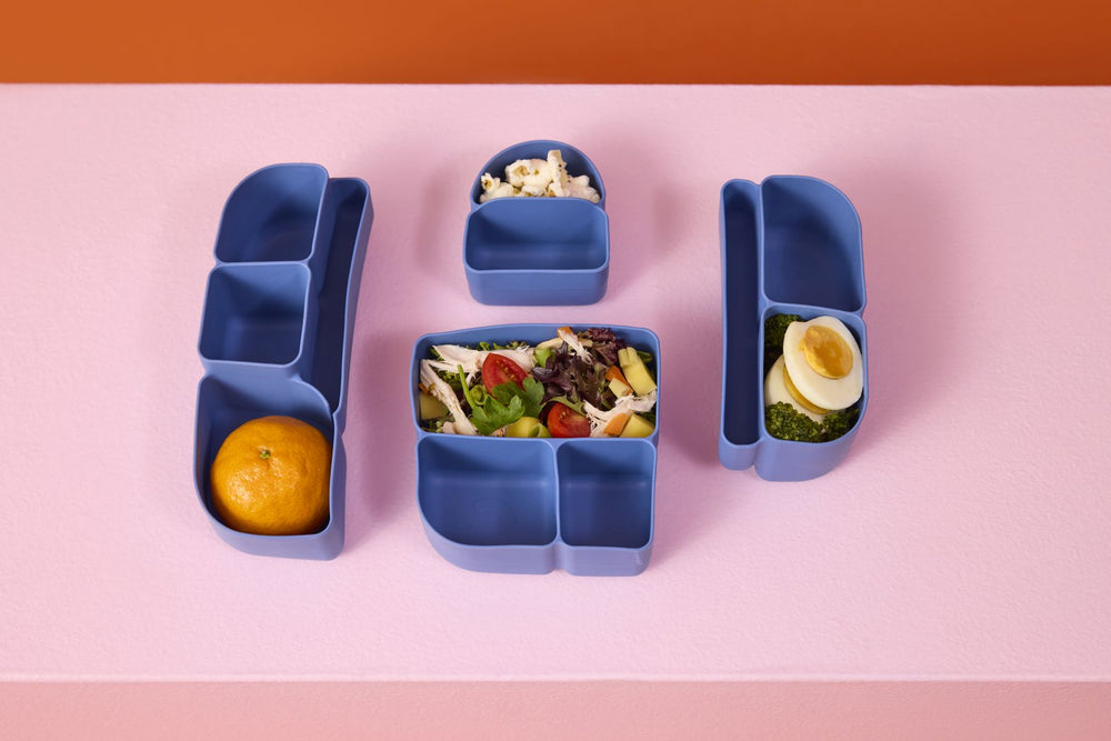 The bento trays feature a convenient slot ideal for storing cutlery or long snacks such as cheese or twiggy sticks.