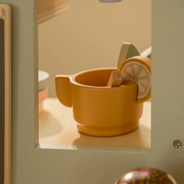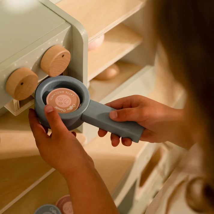 Welcome to the coziest coffee corner! Serve a delicious cup of coffee or tea with a fresh sandwich or pastry. With this beautiful toy coffee corner, your little one can press buttons, choose the right set ting, and place a coffee pad for a true barista experience. The set includes a coffee and tea machine, storage space for cups, and a cabinet to display all the tasty treats. Who’s coming to order something delicious?