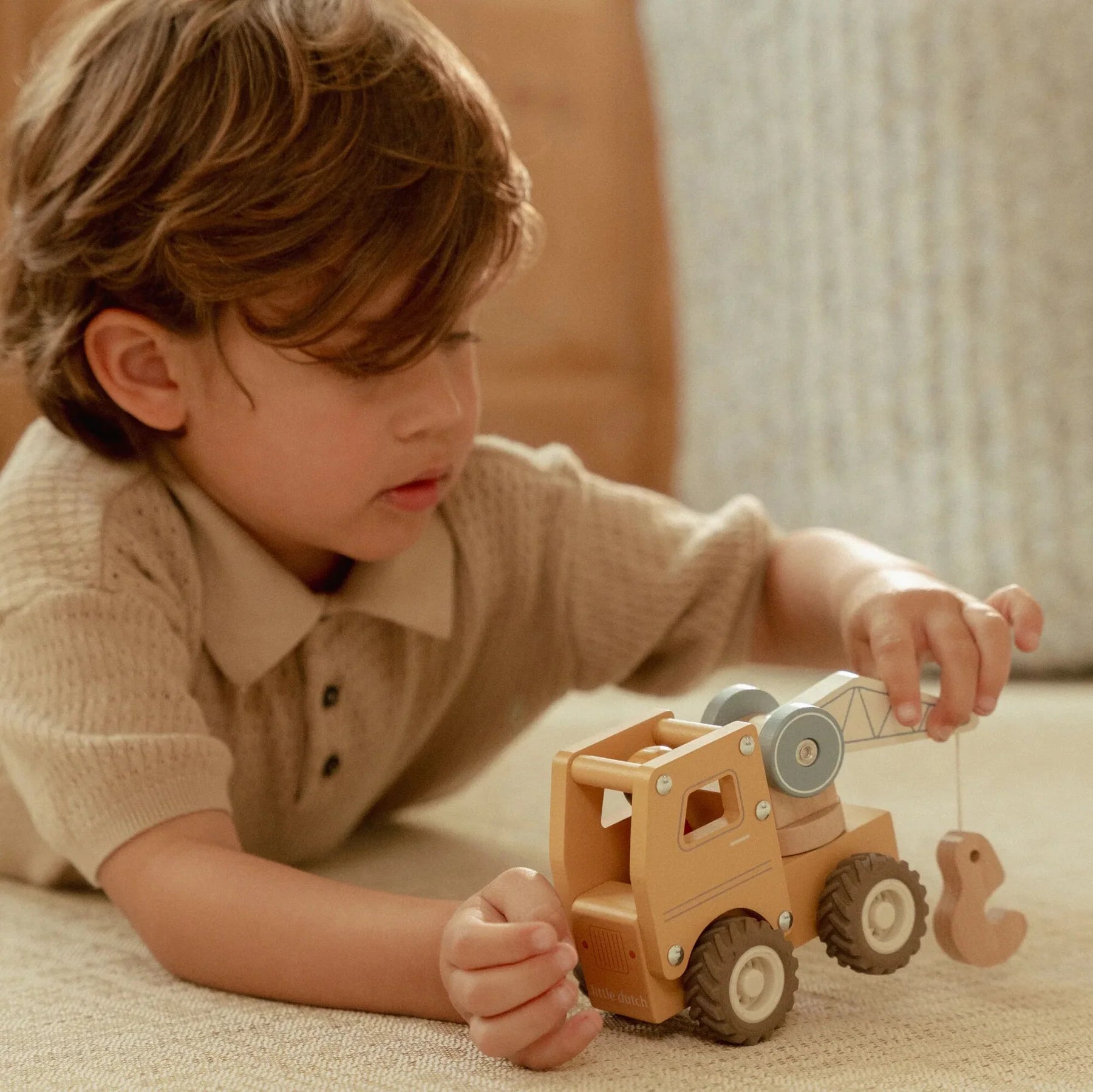 The wooden crane truck has a rotating arm and comes with a construction worker. The rubber wheels ensure a smooth ride across the construction site. Drive to the harbor, load the containers, and place them in the right spot. Combine this crane toy with other construction vehicles for endless fun. Let the building begin!