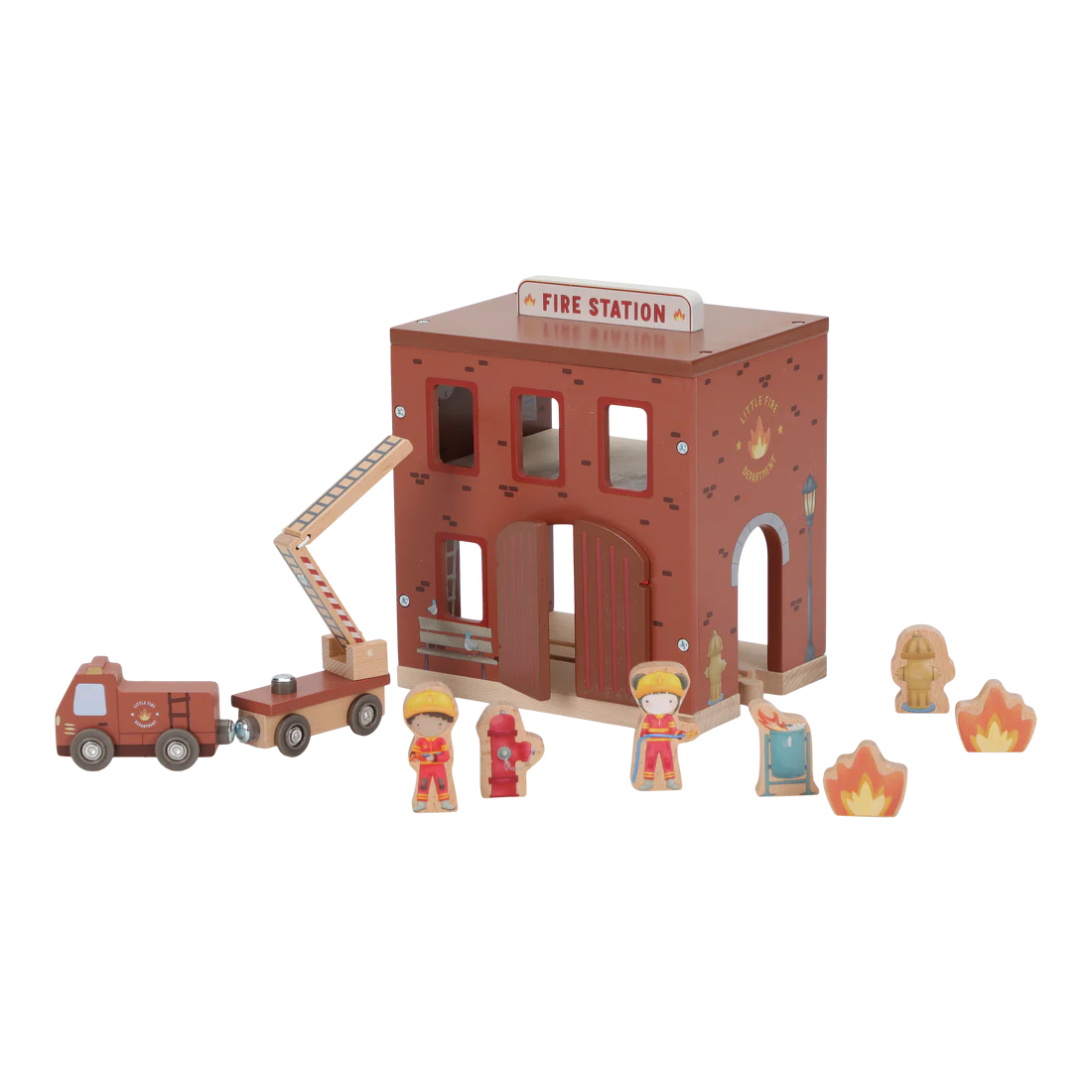 This wooden fire station has everything little heroes need for thrilling rescue missions. Open the station doors, slide down the fire pole, and race off in the wooden fire truck.
