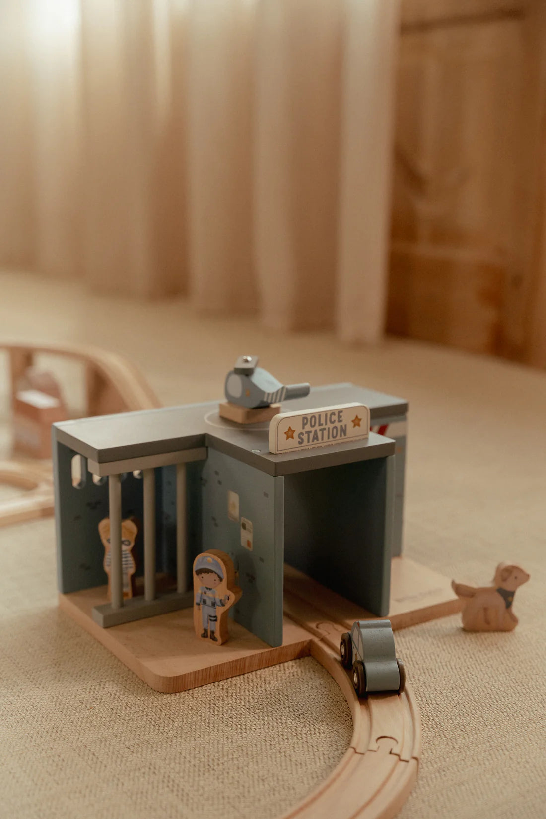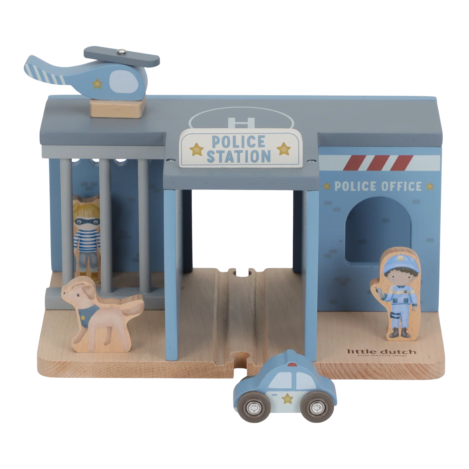 The station features a barred cell and a rooftop landing pad, perfect for keeping the city safe. Children can lock up the thief, chase criminals, and protect the town. Designed to pair with the Little Dutch Train Track XL, this police station toy encourages endless imaginative play. Who will you take to the station?