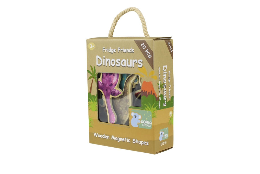 Embark on a prehistoric journey with our Fridge Friends Magentic Dinosaurs from Koala Dream. This captivating wooden toy set features 20 magnetic dinosaur pieces that will transport your child to a land of ancient creatures and endless imagination. Housed in a sturdy natural-themed cardboard box, complete with a convenient cotton rope handle, this playset is designed for easy storage and on-the-go fun. Watch as your child brings the dinosaurs to life, creating epic Jurassic scenes by arranging and rearranging the magnetic pieces on any magnetic surface.