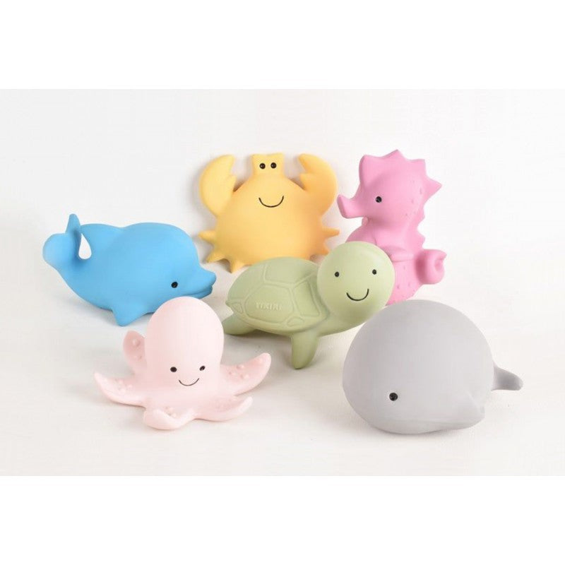 An enchanting sea creature collection of sustainable rubber rattle and teethers provide teething relief and gentle play for the very young. Each marine animal character creates a rattle sound that will provide fundamental lessons in cause and effect while aiding in the development of fine motor skills. These ocean friends make a fantastic addition to bath time or water play, and fully sealed for hygiene.