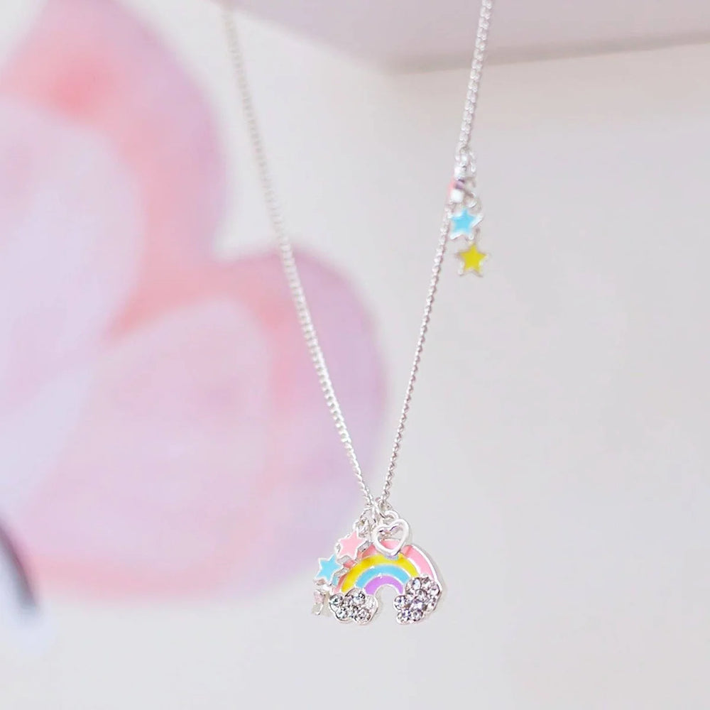 Oh, so sweet is this NEW rainbow necklace! It reminds us of Summer days, ice creams, and blue skies! So much fun! In a lullaby land where all your dreams come true, filled with rainbows, soft clouds, and glittering stars, you will always fly higher than you thought you ever could. This dreamy Somewhere Over the Rainbow necklace is endless colors and shining diamantés, with a cute silver heart charm for someone whose heart is set on the stars.
