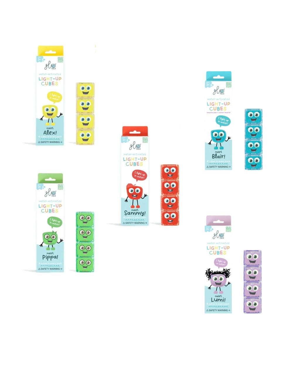 Perfect for sensory play, water play and bath time! Put them in water and watch them light up. Then shake them off, dry and place on side. Each pack comes with 4 light-up cubes.