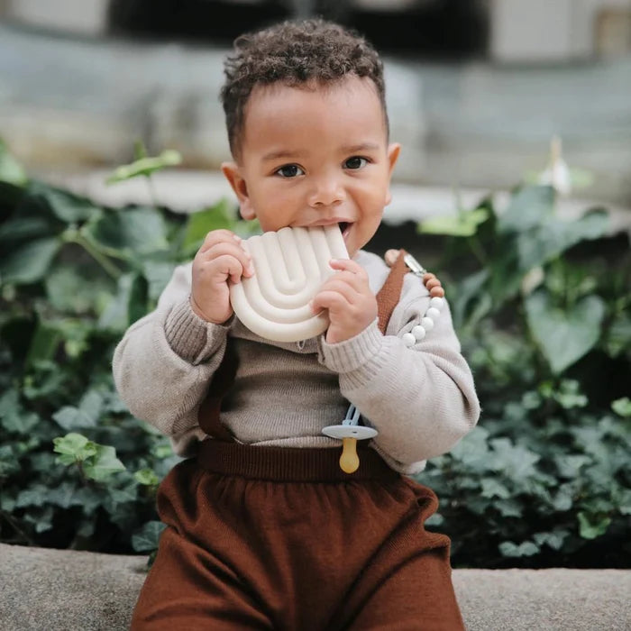 Mushie teethers are designed to help soothe your baby’s irritated gums when teeth are starting to come out. The line of teethers is made from food-grade silicone, and they are designed to be easy to grasp by tiny baby hands.