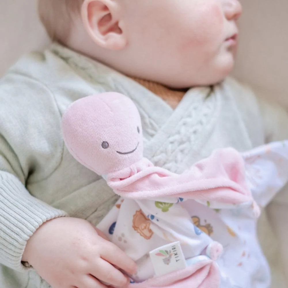 An adorable soft organic octopus blankie that is sure to become your child's best friend. This comforting toy features a soft octopus shape with pretty pink fabric on one side and printed ocean buddies on the other.